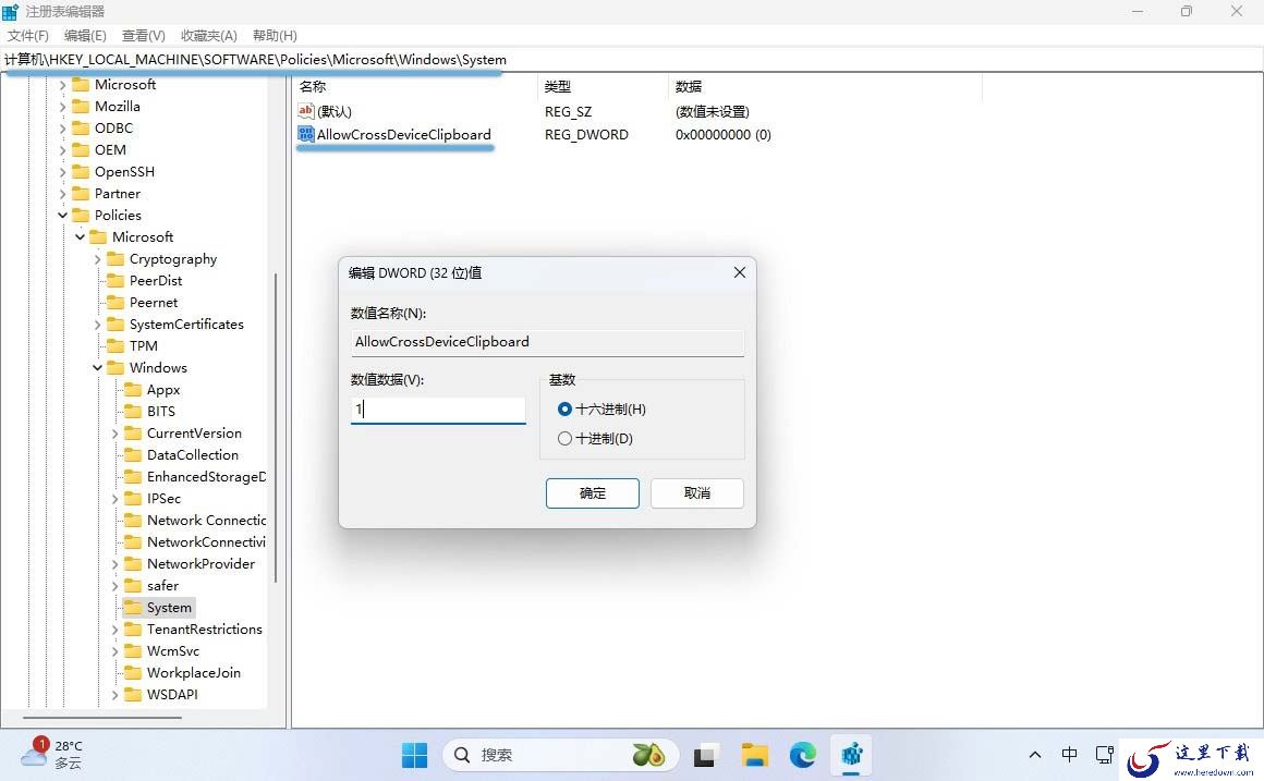 3、新建一个名为 AllowCrossDeviceClipboard 的 DWORD(32 位)值,并将其十六进制值设置为 1。