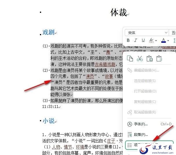 2、第二步,打开文字文档之后,我们在文档页面中选中有编号的段落,然后右键单击打开“项目符号和编号”选项