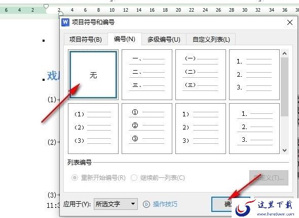 3、第三步,打开“项目符号和编号”选项之后,我们在项目符号和编号弹框中点击选择“无”选项,再点击“确定”选项即可