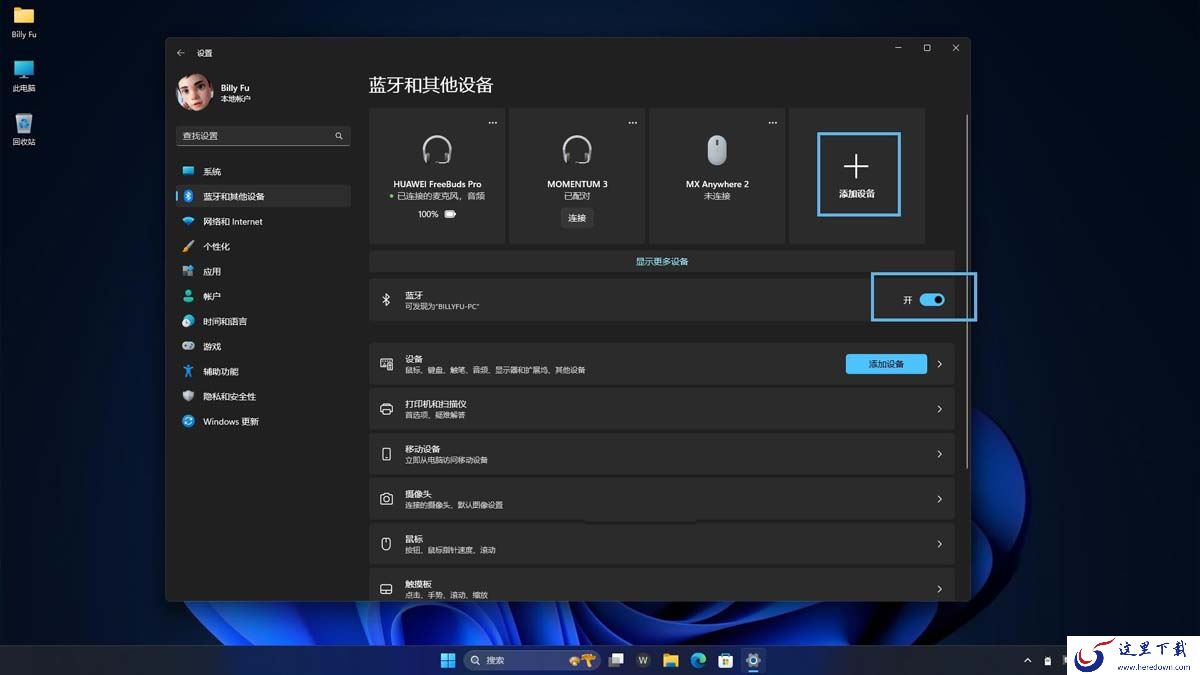 1、按Windows + I快捷键打开「设置」,在左侧选择「蓝牙和其他设备」,然后在右侧打开「蓝牙」功能。
