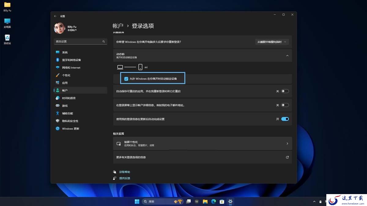 2、展开「动态锁」区域,勾选「允许 Windows 在你离开时自动锁定设备」。
