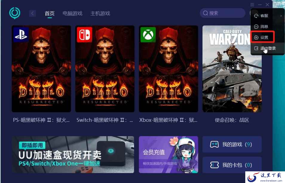1、在UU加速器的主界面上,找到并点击右上角的“三条杠”图标,选择设置,然后点击“账户安全”。