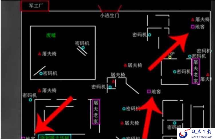 1,以军工厂为例,这个地图有三个地窖:一个在无敌房外围,一个在小木屋前的两个围墙之间,一个在中场四合院附件。