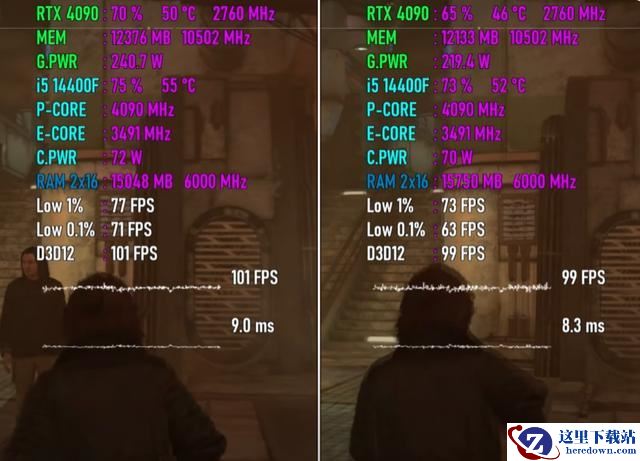 Windows 11 23H2平台的平均帧速为101 FPS,最低瞬时帧速为77 FPS,帧时间为9.0ms,CPU使用率为75%,功耗为72W,温度为55度,内存使用量为15.0GB,GPU使用率为70%,显存使用量为12.4GB,功耗为241W,温度为50度。Windows 11 24H2平台的平均帧速为99 FPS,最低瞬时帧速为73 FPS,帧时间为8.3ms,CPU使用率为73%,功耗为70W,温度为52度,内存使用量为15.8GB,GPU使用率为65%,显存使用量为12.1GB,功耗为219W,温度为46度。在这款游戏中,Windows 11 24H2平台的CPU使用率比对手低2%,内存使用量高0.8GB,GPU使用率低5%,显存使用量低0.3GB。