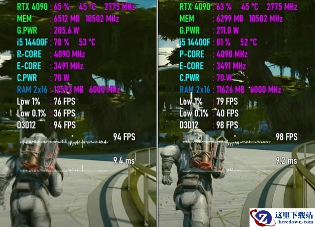 Windows 11 23H2平台的平均帧速为94 FPS,最低瞬时帧速为76 FPS,帧时间为9.4ms,CPU使用率为78%,功耗为70W,温度为53度,内存使用量为12.6GB,GPU使用率为65%,显存使用量为6.5GB,功耗为206W,温度为45度。Windows 11 24H2平台的平均帧速为98 FPS,最低瞬时帧速为79 FPS,帧时间为9.2ms,CPU使用率为81%,功耗为70W,温度为52度,内存使用量为11.6GB,GPU使用率为63%,显存使用量为6.3GB,功耗为211W,温度为45度。在这款游戏中,Windows 11 24H2平台的CPU使用率比对手高3%,内存使用量低1GB,GPU使用率低2%,显存使用量低0.2GB。