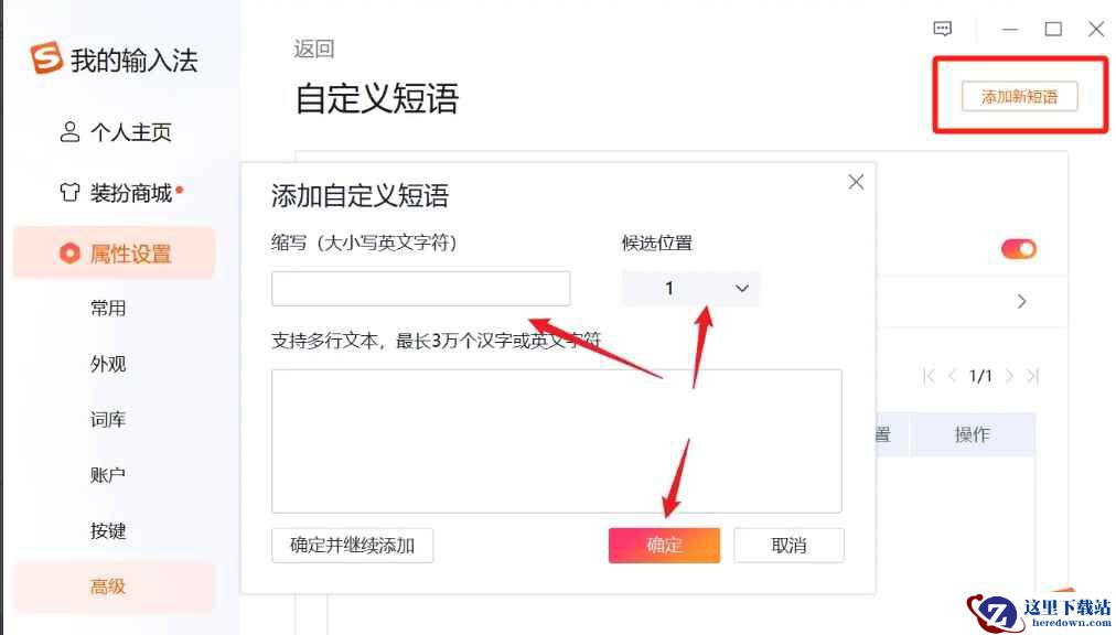 2、点击“添加新短语”按钮,然后进行短语添加,完成短语和缩写的设置后,点击“确定”按钮进行保存即可。