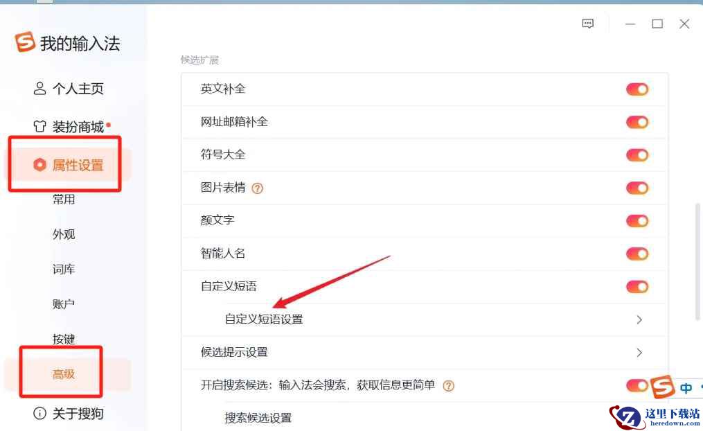 1、在搜狗输入法的主界面选择“属性设置”,点击“高级”选项,然后点击“自定义短语”选项。