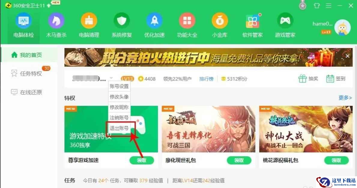 在菜单栏中找到并点击“退出账号”选项,即可退出360安全卫士的登录。
