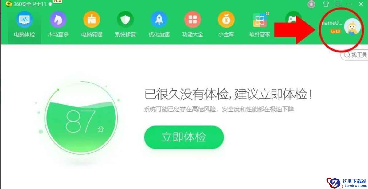 1、打开360安全卫士:在360安全卫士的首页页面右上角,找到并点击自己的头像图标。