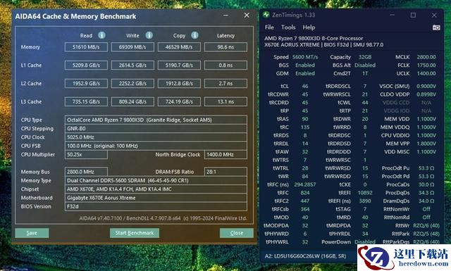 我们给雷克沙ARES RGB DDR5-6000 C26内存套装搭配AMD锐龙7 9800X3D、RTX 4090显卡、技嘉X670E AORUS XTREME主板进行测试,首先是内存的默认设置。