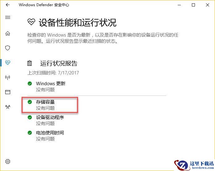 你可能会想问,安全与存储有什么关系呢?其实在 Windows 10 Creators Update 中,微软为 Windows Defender 添加了一个新的用户界面,以提醒用户有关设备的运行状况和性能情况,当然还包括了当前系统的存储容量问题。如果设备的磁盘空间不足,则可能无法安装 Windows 关键更新。