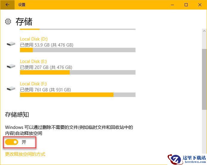 Windows 10 创意者版(1703版)后,Windows 设置中增加了一个有关清理文件的功能—— 存储感知,系统会通过删除不需要的文件(例如临时文件和回收站中的内容)自动释放空间。