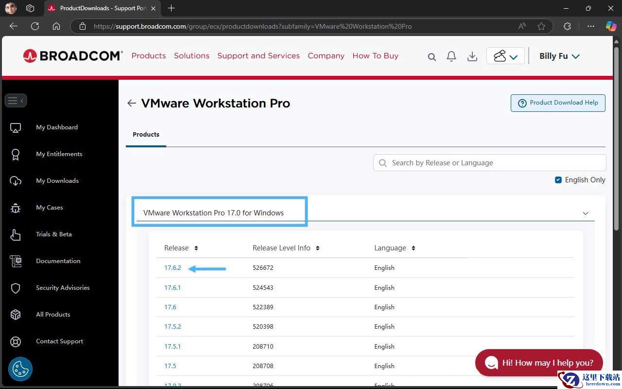 4、展开「VMware Workstation Pro 17.0 for Windows」,选择最新版本,比如17.6.2。