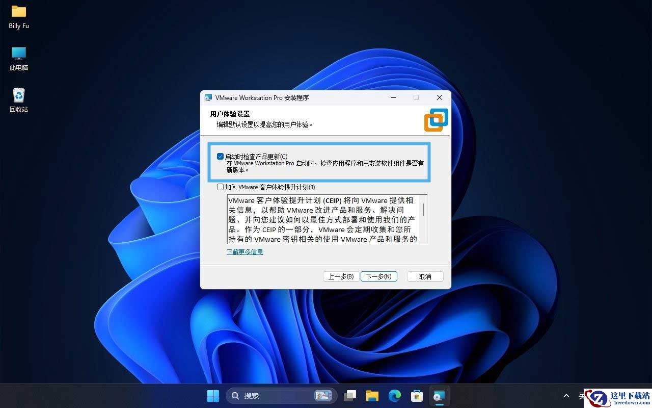 4、勾选「启动时检查产品更新」并取消「加入 VMware 客户体验提升计划」,然后点击「下一步」。