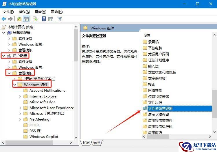 2、接着,在打开的界面中,依次点击打开“用户配置-管理模板-Windows组件-文件资源管理器”。