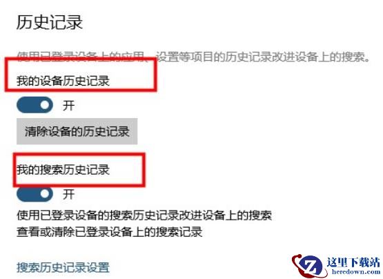 2、将打开的页面拉至最下方,可以看见我的设备历史记录、我的搜索历史记录将它们关闭即可。