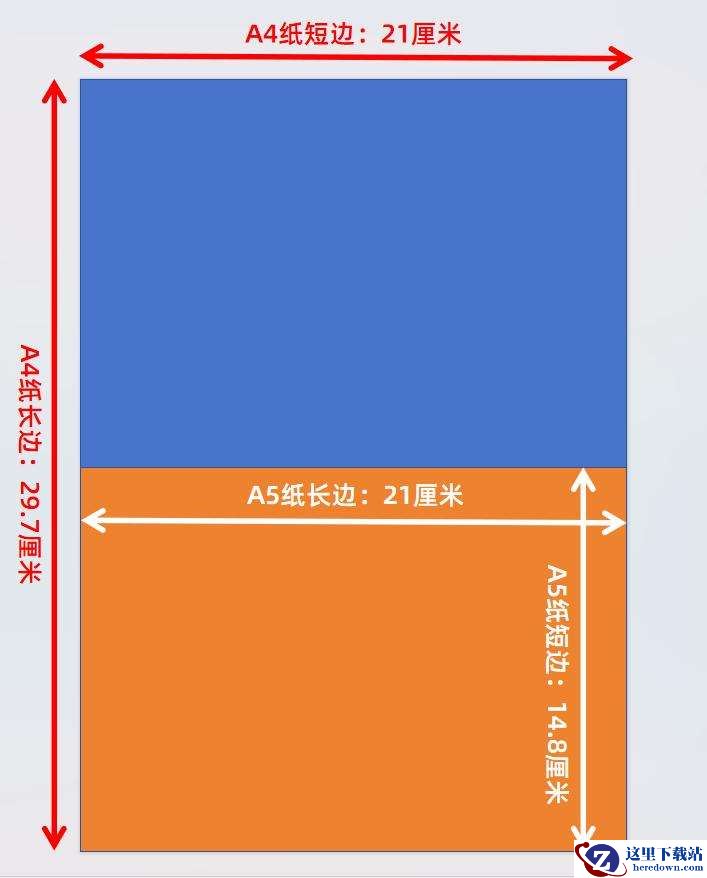 根据国际标准(ISO 216)的定义,A4纸规格为21cm×29.7cm(210mm×297mm);将A4纸的长边对切,可得到2张A5纸,A5大小为14.8cm×21cm(148mm×210m)。
