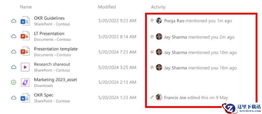 对于使用工作或学校账户(Entra ID)登录的 Windows 内测用户,文件资源管理器将在“活动”列以及文件资源管理器首页顶部的“推荐”区域显示人物图标。当用户将鼠标悬停或点击人物图标时,将显示来自 Microsoft 365 的该人物的实时人物卡片。