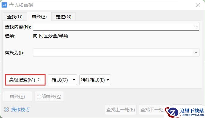 2、同时按ctrl+h组合键,调出“查找和替换”对话框,单击下方的“高级搜索”按钮,可以展开更多选项。