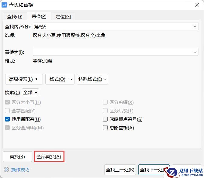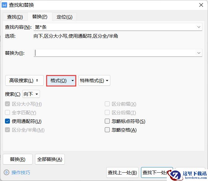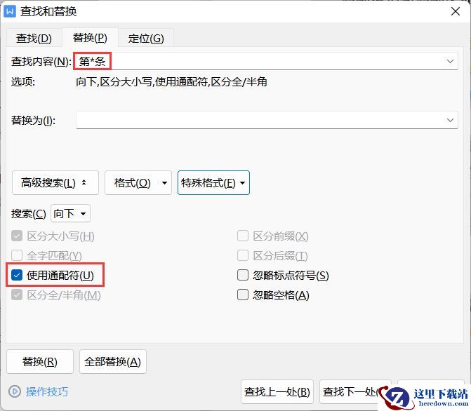 3、在“查找内容”编辑框中,输入“第*条”(这里的“*”为通配符,可以代表一个或多个字符),勾选“高级搜索”下面的“使用通配符”选项。