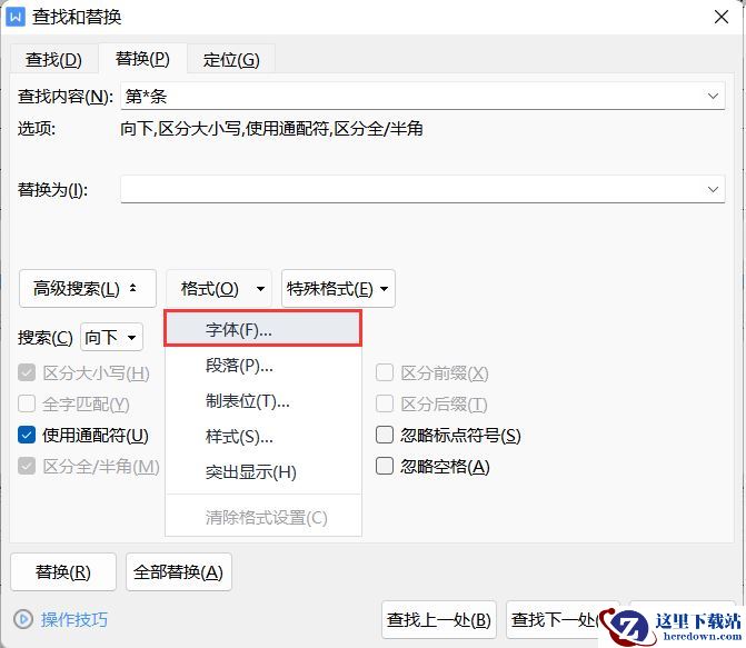 4、将光标定位在“替换为”编辑框中,单击“格式”按钮右侧的倒三角,在下拉列表中选择“字体”。