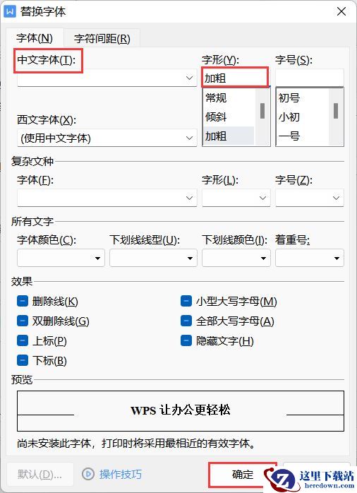 5、在打开的“替换字体”对话框中,设置“中文字体”的“字形”为“加粗”,单击对话框下方的“确定”按钮。