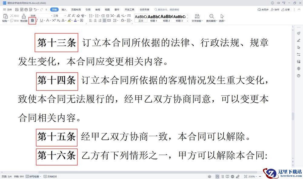 下图是一份多页的合同协议书,下面我们想将协议书中所有“第X条”的字样(参见红框标注处)全部进行加粗显示。