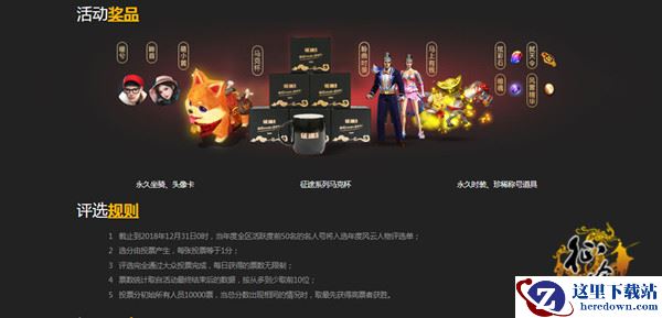 十大风云人物奖:每人可获得风云人物大礼包,内含萌小黄(永久坐骑)、马上有钱(50W数值血称号)、聆曲时装(永久百合仙子裙)、暖兮/眸首(永久头像卡)、炫彩石(2019个)、风雷精华(2019个)、弑天令(2019个)、暗魂(2019个);投票幸运玩家:每人可获得征途系列马克杯一个,共50个名额。