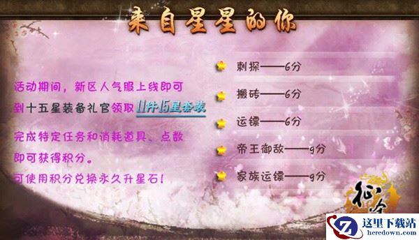 ■来自星星的你:凡是成功预创建的玩家,在开区前都能获得相应的星星积分。开区后,玩家完成特定日常任务和消耗指定道具也可以获得星星积分,累计积分达到要求就可在NPC福神处领取升星石,最高可领取15星升星石!