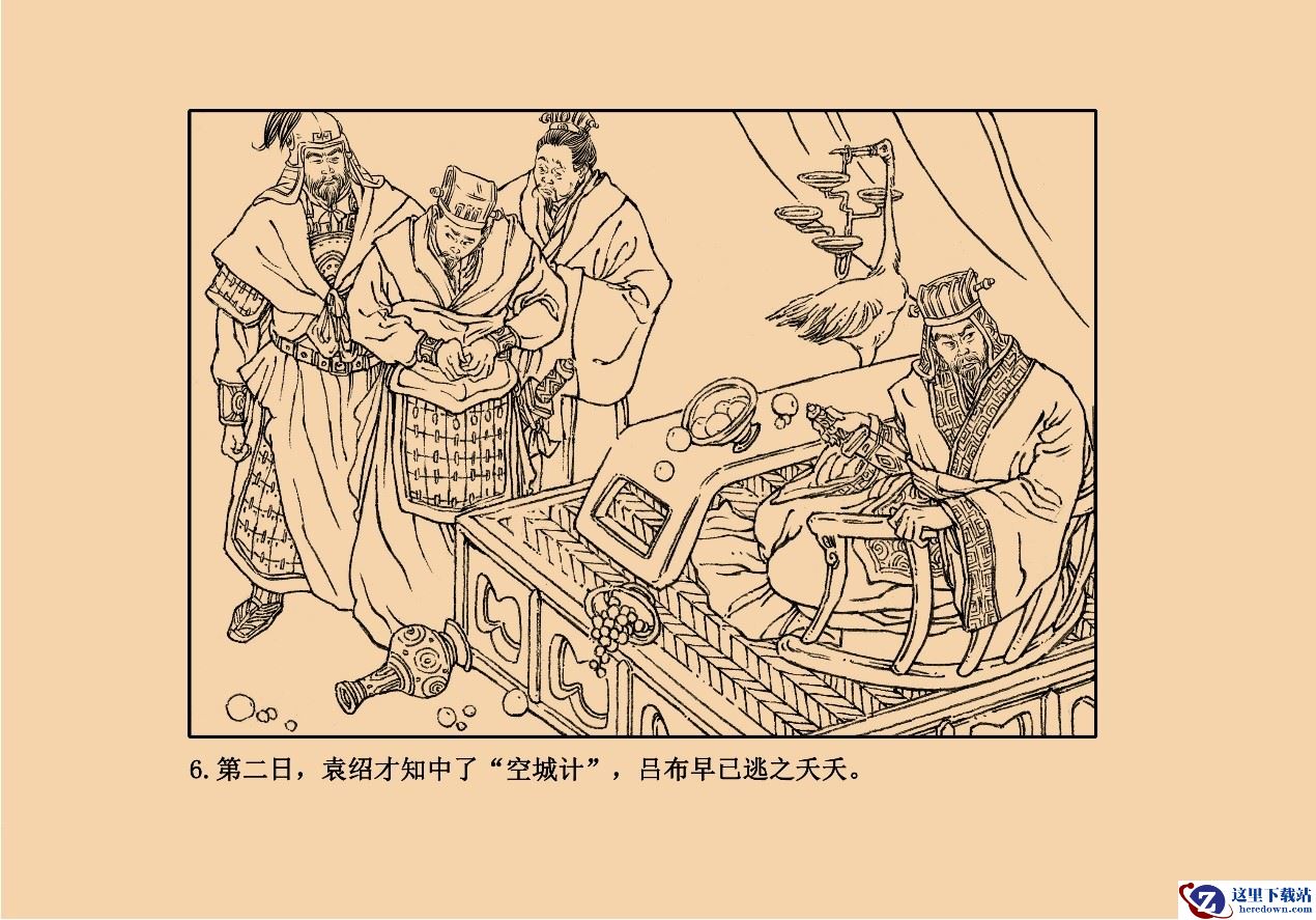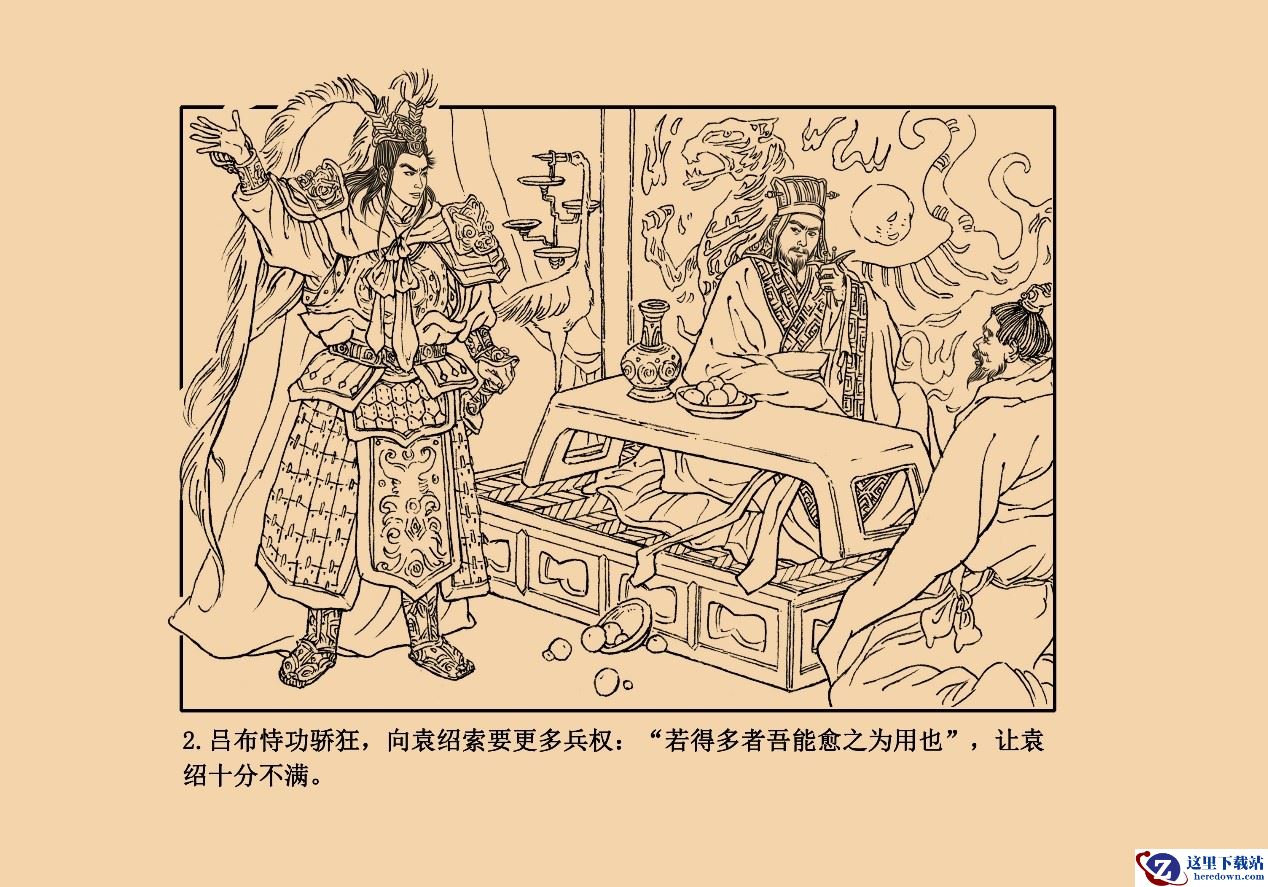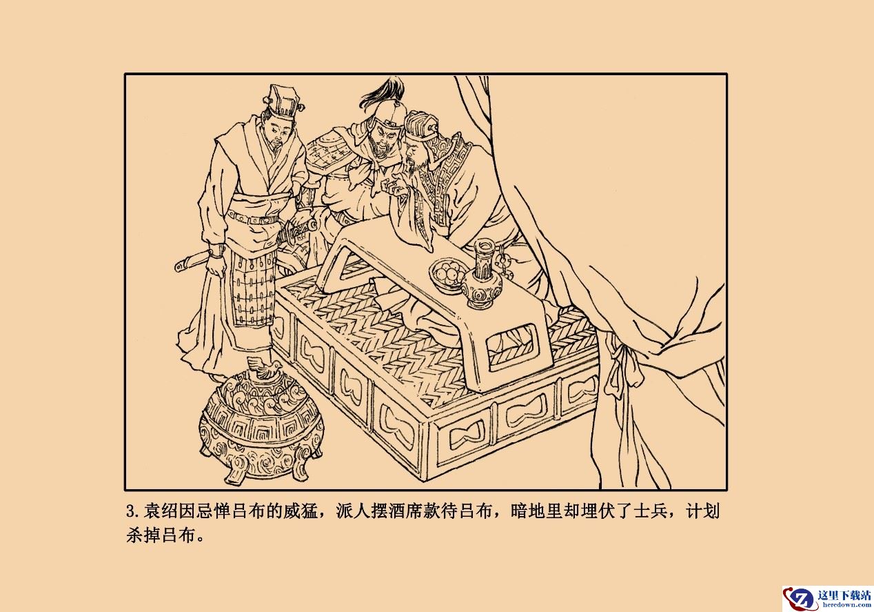 本期的连环画描绘了吕布“施巧计急脱身”的故事:吕布在刺死董卓,逃脱长安后,又去投奔袁绍,但因为人高傲自矜,贪婪无度引来了袁绍的猜忌。袁绍便邀请吕布赴宴,暗中埋伏士兵打算除掉吕布。