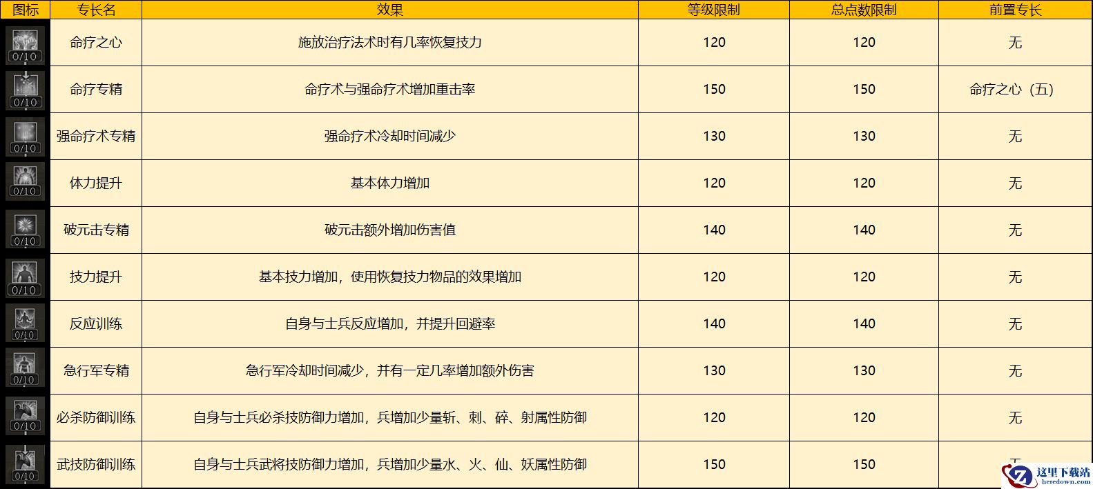 在谋士的众多专长中,比较重要的有“命疗专精”、“技力提升”、“必杀防御训练”和“武技防御训练”这四个专长。“命疗专精”可以提升命疗术和强命疗术的重击率,大大提高了谋士的生命值回复量。“技力提升”则可以增加谋士的基本技力,还能增加恢复技力物品的效果,是谋士的核心专长之一。“必杀训练防御”和“武技训练防御”可以提升自身和士兵的必杀技防御力和武将计防御力,并且可以增加少量的属性防御。