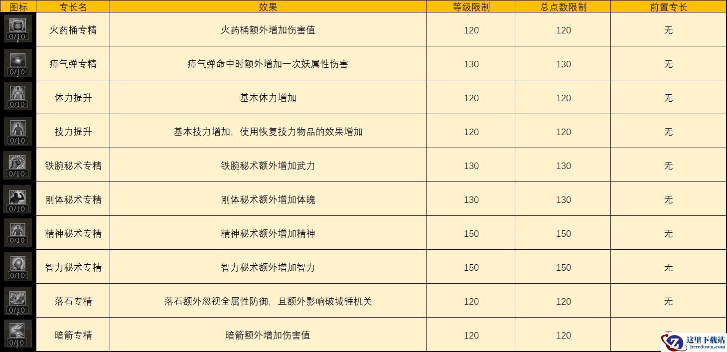 博士比较重要的专长是“瘴气弹专精”、“技力提升”、“落石专精”这三大专长。“瘴气弹专精”可在命中目标时额外附加一次妖属性伤害,加强了博士的输出能力,“技力提升”可以增加基本技力,并增加恢复技力物品的效果,是博士的核心专长之一。“落石专精”可以提供忽视全属性防御的效果,并且能够影响到破城锤机关,在国战中作用巨大。