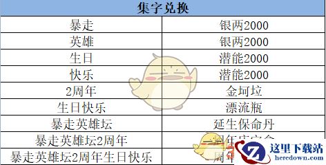 打开“周年庆集字福袋”随机获得:暴、走、英、雄、坛、2、周、年、生、日、快、乐。12个字其中之一。