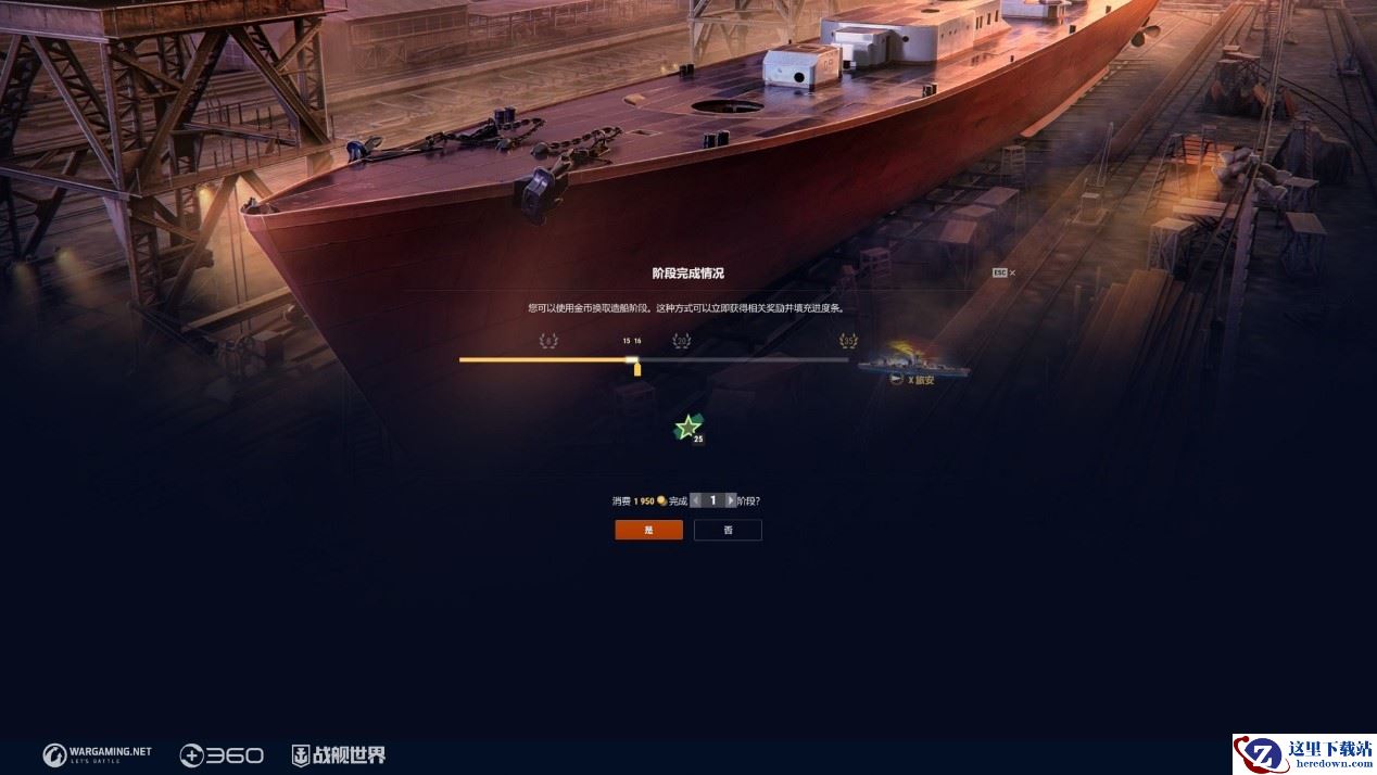在造船厂中,旅安的建造共分为35个造船阶段,其中30个造船阶段可通过完成造船厂作战任务完成。当然可以花费金币推进造船阶段,每个阶段的价格为1950金币。在使用金币完成造船阶段后,仍然可以完成造船厂任务,这时完成每个阶段将会获得钢铁奖励。