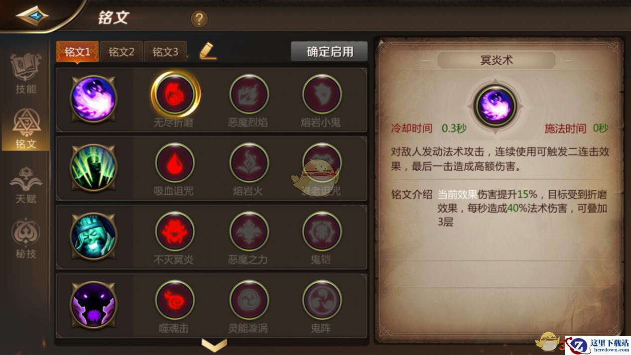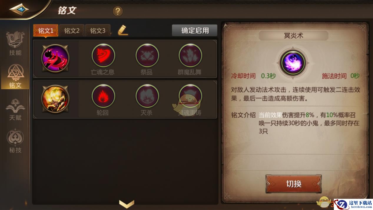 铭文:每个技能都有三个铭文可以进行搭配。铭文跟天赋一样都3种方案。