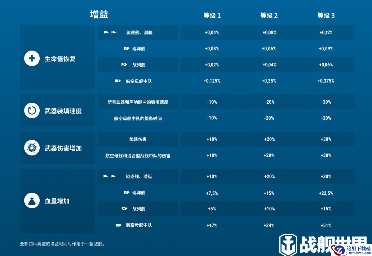 增益区域可以提供四种增益类型,包括生命值回复、武器装填时间减少、武器伤害增加和最大生命值提升。当然,针对不同舰船类型,增益区域所提供的加成也有所区别。每种增益分为3个级别,重复夺取同种增益,其加成效果也会叠加。增益区域在生成的两分钟后可进行夺取。区域激活后,率先驶入的玩家将为自己和所有友军的战舰夺得增益。
