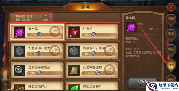 在商会购买宝石需要花费克朗,且每日会出售的宝石类别不同。各位勇士如果想要通过商城购买某一特定类别宝石,要注意看它的刷新哦。