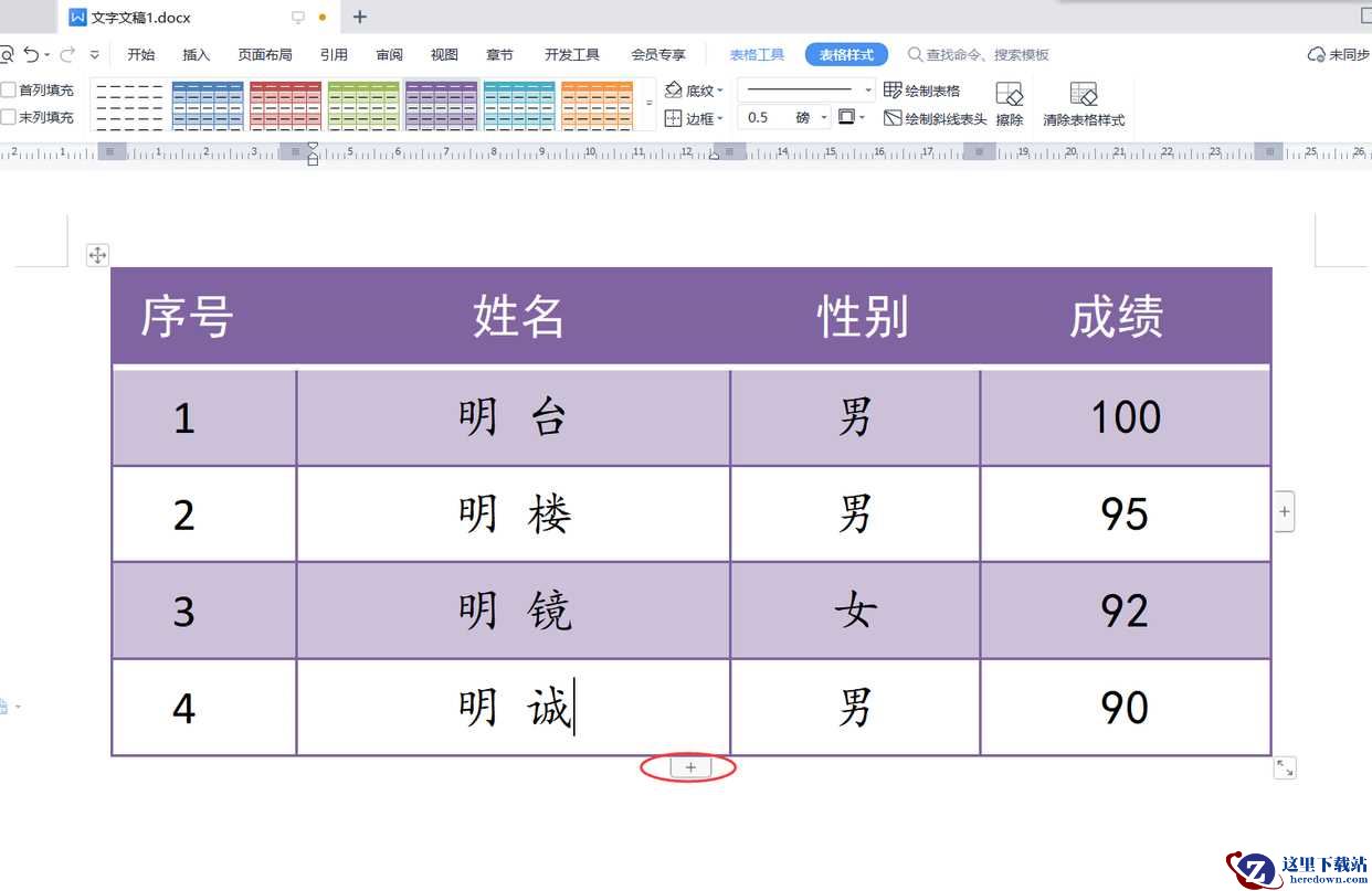 很多朋友常用的给表格添加新行的方法是这样的:将光标定位在表格任一单元格内,表格下方会出现一个+按钮,再通过单击该按钮添加新行。这种方法的局限在于,每单击一次+按钮,只会在下方新增加一行。我们尝试单击+按钮,原表格下方只增加了一行空白行(序号“5”为表格自动编号自动生成)。