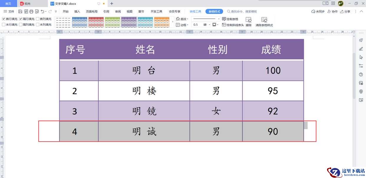 1、选中表格最后一行(选中后该行会显示为灰色底纹)。