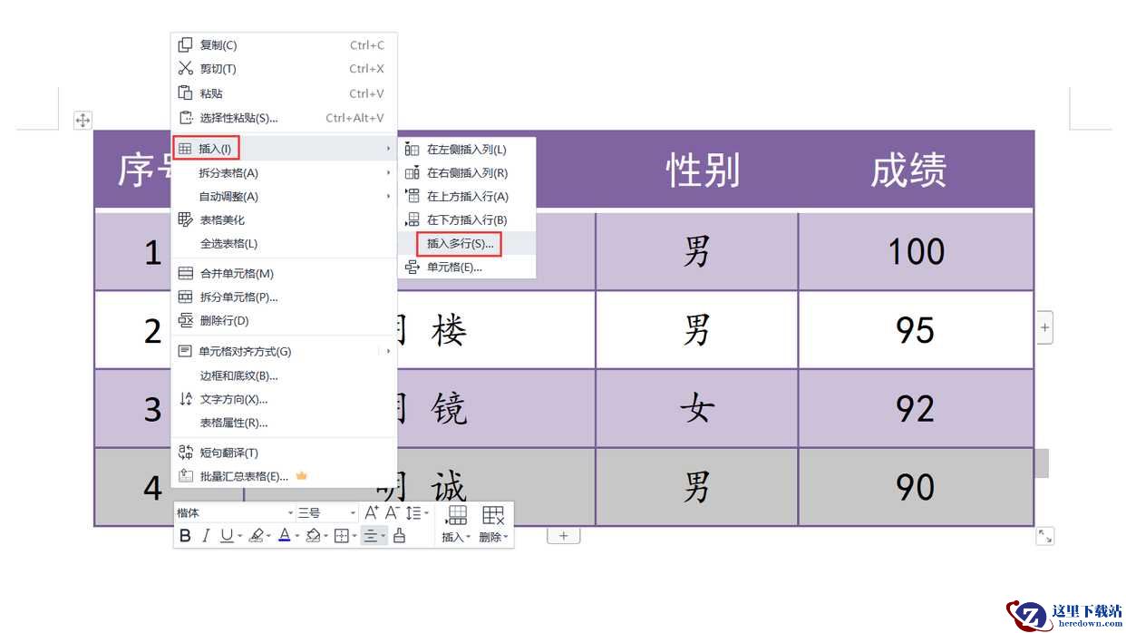 2、将鼠标光标移动到最后一行的任一单元格中,单击鼠标右键,在弹出的菜单中选择“插入”,在弹出的级联菜单中选择“插入多行”。