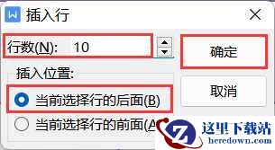 3、在弹出的“插入行”对话框中,设置“行数”为“10”,“插入位置”为“当前选择行的后面”,最后单击“确定”按钮。