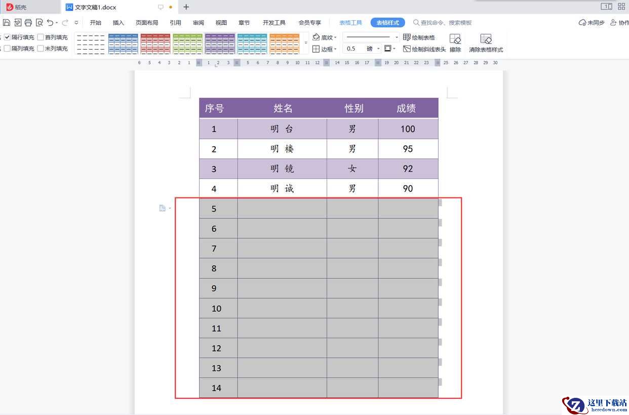 4、返回文档,可见表格下方已经批量添加了10个新行。