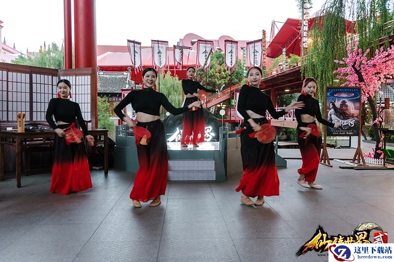 热闹非凡的“凌霄城”街边,身着古风韵味服装的美女们,为人来人往的游客献上优雅的舞蹈。