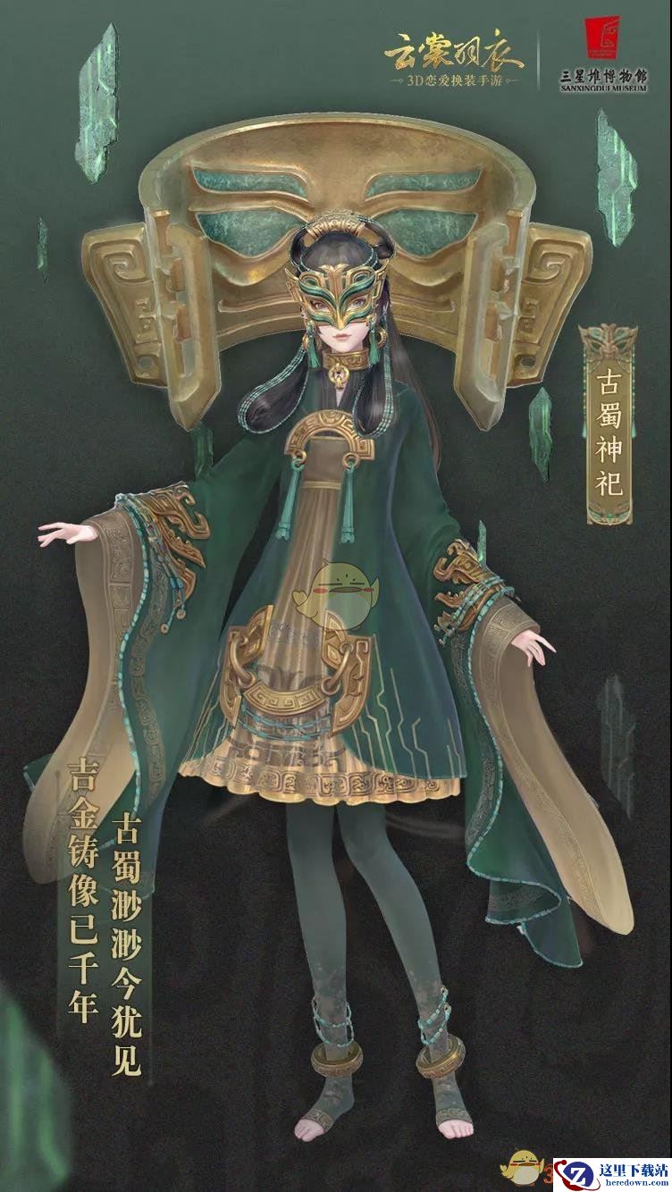 云裳羽衣与四川广汉三星堆博物馆联手打造的【古蜀神祀】主题限时活动即将开放,服饰设计灵感源自三星堆博物馆藏品【戴金面罩青铜人头像】,金面罩用金皮捶拓而成,大小、造型和铜头像面部特征相同,眼眉部镂空,制作颇为精致,给人以权威与神圣之感。