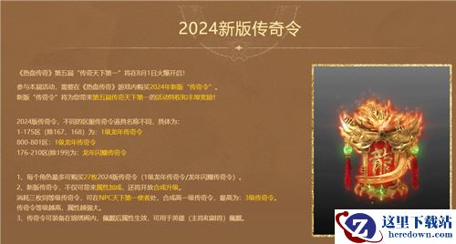 2024年新版“传奇令”全新升级,这块神秘的令牌将为你带来参与活动的特别福利和一系列令人垂涎的奖励。令牌本身不仅可以为您带来属性加成,还可以进行合成升级。只需消耗三枚同等级的传奇令,你就可以在NPC天下第一使者处合成更高一级的传奇令,最高可达3级。传奇令的等级越高,所带来的属性加成也就越强大!