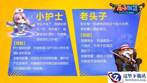小护士的主动技是快速回血,典型的辅助技能,保护队友打出更多输出也是功劳甚大呢!老头子的主动技能是搭建一个炮台,炮台可以攻击一个范围内的敌人,进攻防守都是威力无穷。当然如此威力巨大的技能,cd时间也会更长,要好好考虑如何安全度过技能冷却期哦~