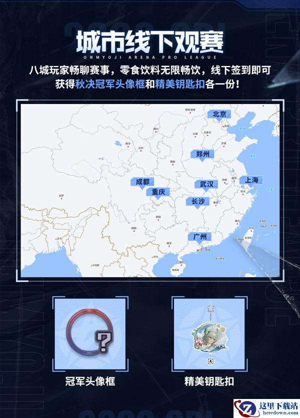 本次秋季赛总决赛将在北京、上海、广州、重庆、成都、武汉、郑州、长沙这八大城市开启线下观赛活动。同城玩家们欢聚一堂互诉热爱,共同见证逐梦少年登顶时刻。线下签到还可获得伴手礼——秋季总决赛冠军头像框与精美钥匙扣各一份。
