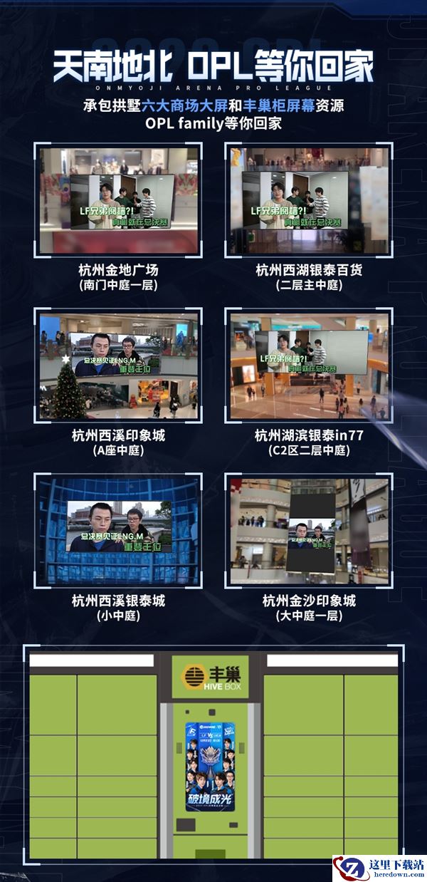 为给各位阴阳师带来更好的观赛氛围,O盟承包了拱墅区六大商场大屏和丰巢柜屏幕为秋季总决赛选手助威,期待阴阳师们前往打卡哦!
