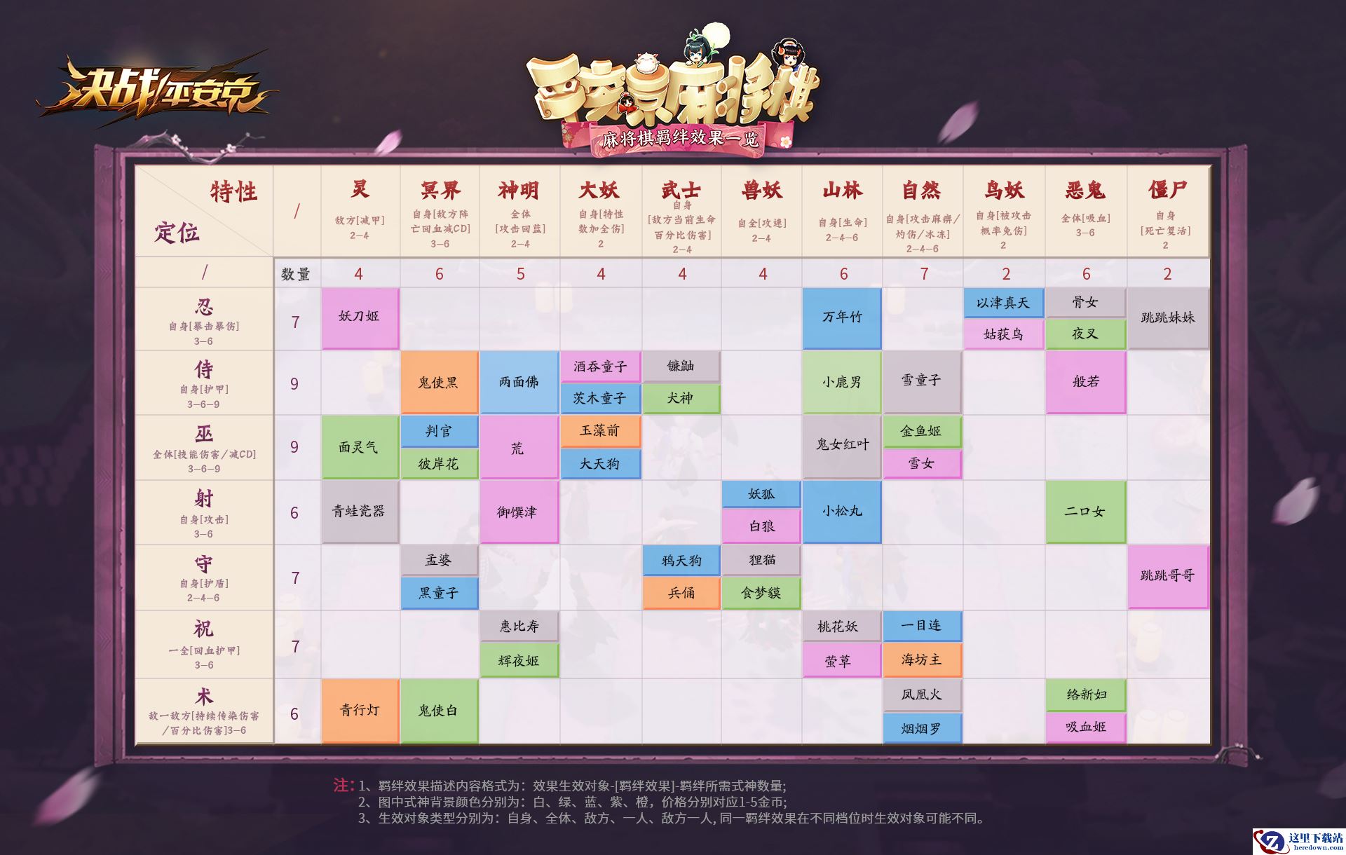 激活羁绊,式神增益。此外,而拥有相同定位或特性的牌在场上达到一定数量,还会激活羁绊效果。同一类羁绊会分多个档次,成功激活羁绊效果将获得强大的增益属性。同时,特殊麻将棋“呱太”还可以替代任何定位或特性,当呱太上场时,己方所有定位的麻将棋羁绊数都增加一点!大人们通过为场上的牌进行升星羁绊,碰牌升星,激活羁绊效果,将自己手上的式神组合出最强克敌阵容!