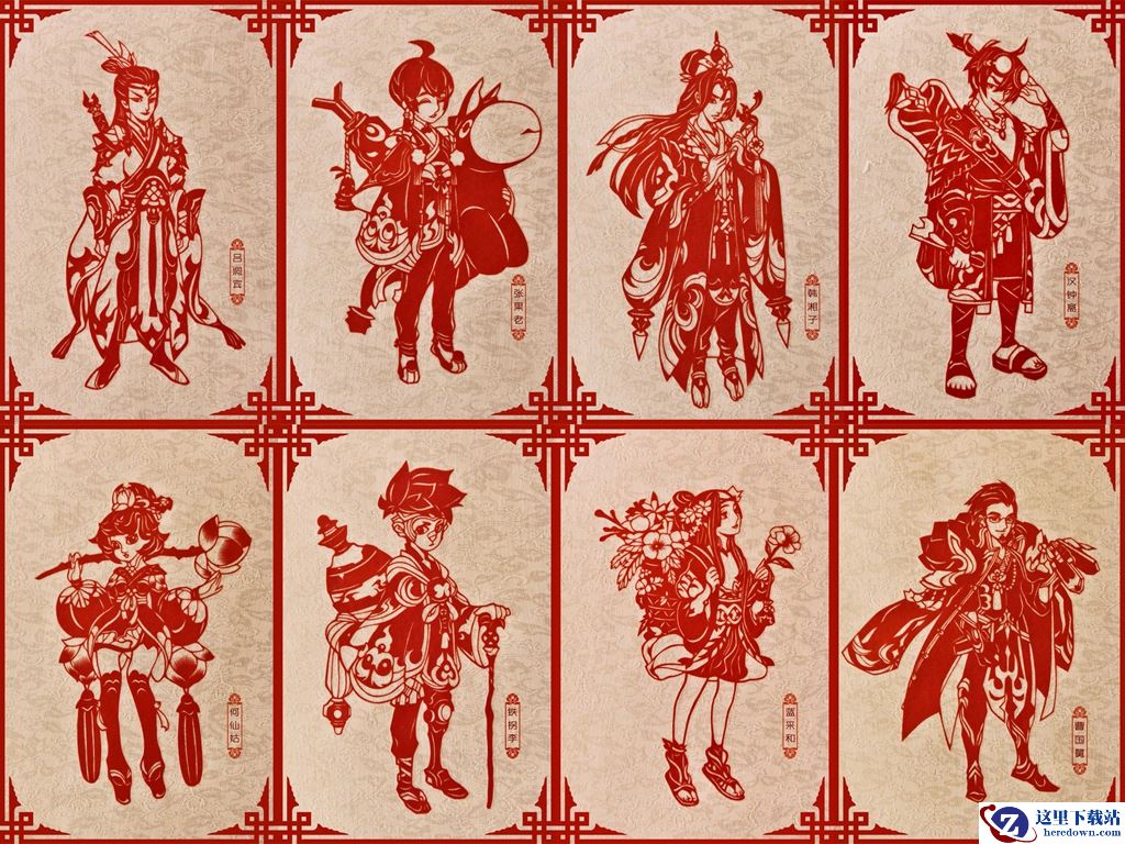 《自由幻想》手游以八仙传说为剧情主线,将非遗传说数字化还原在游戏中,玩家可以在游戏内感受八仙传说的人物和故事魅力。本套剪纸图案来源于《自由幻想》手游中的八仙形象,耳熟能详的八仙张果老、何仙姑、吕洞宾等八仙人物被全新的演绎。